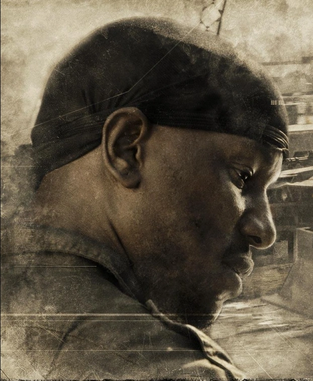Joe is an African American man with some facial hair, about 5'11" tall. He wears a bandana tied around his head and a white shirt under his sleeveless Terminal Island uniform. He has self-inflicted scars on his face.